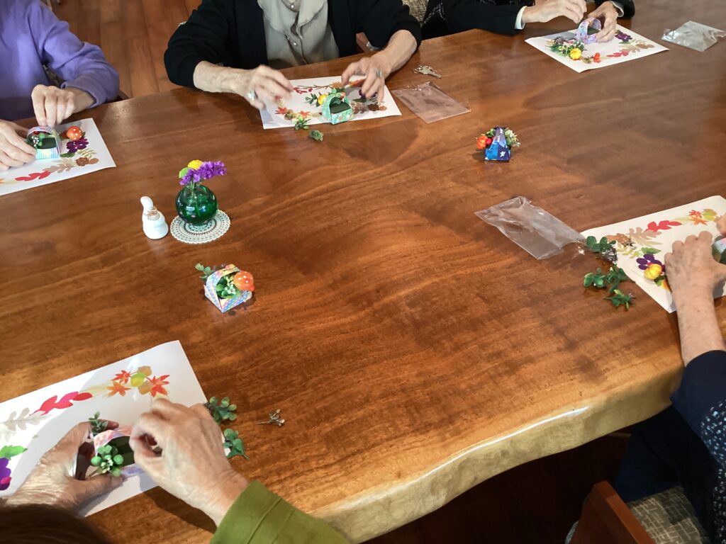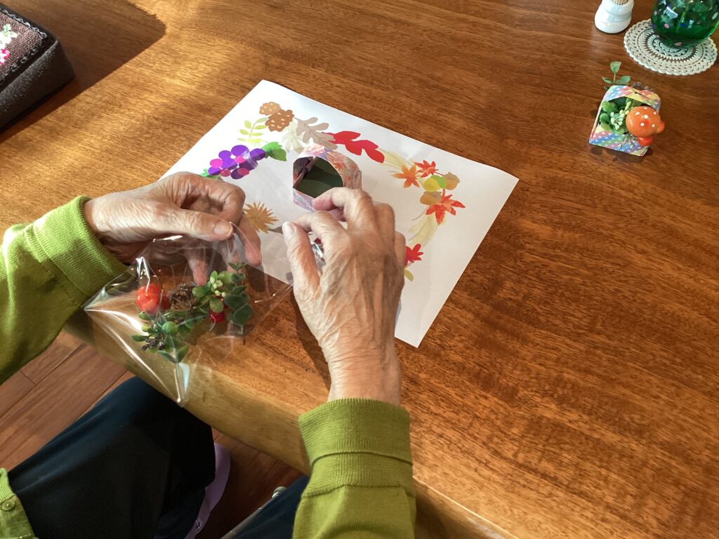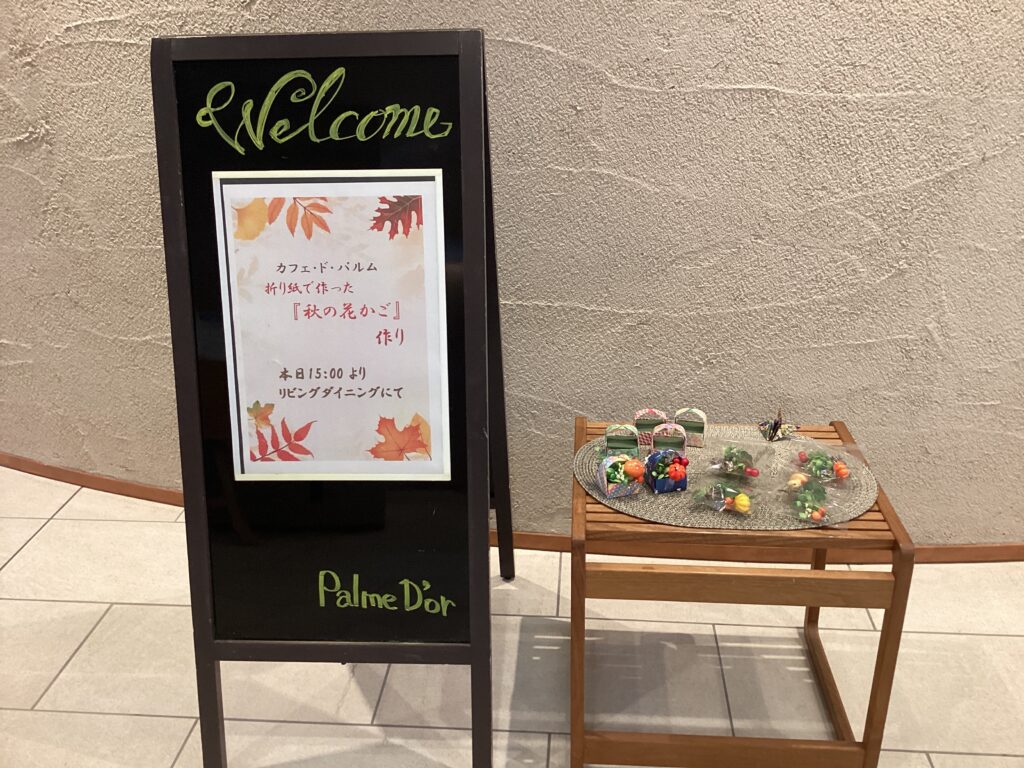 本日秋晴れの午後、カフェドパルムでは、秋の空気を感じられる “花かごの飾り“ に皆で挑戦いたしました。