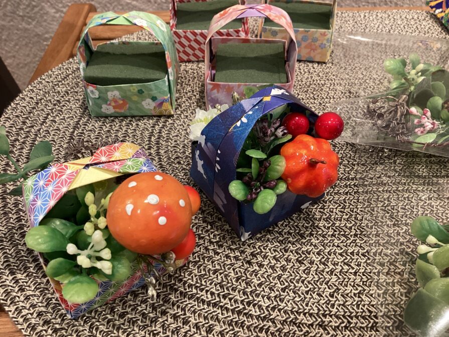 手際よく作業を進められ、和やかな雰囲気の中、素敵な秋の花かごが完成いたしました。