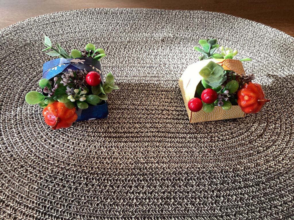 折り紙で作った花かごに彩りよくお花を挿して、花かごを作っていきます。