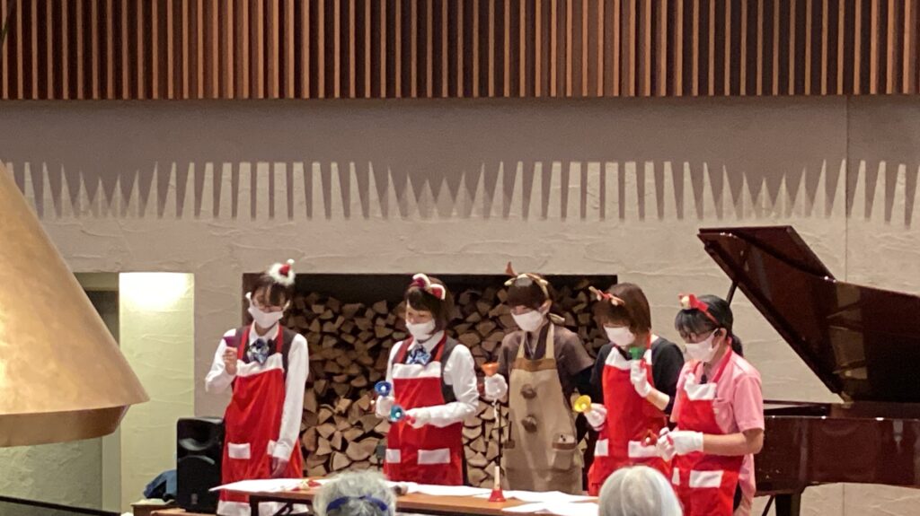 パルムドールスタッフによる、ハンドベルの演奏は 「赤鼻のトナカイ」「もろびとこぞりて」「アメイジンググレイス」の3曲。