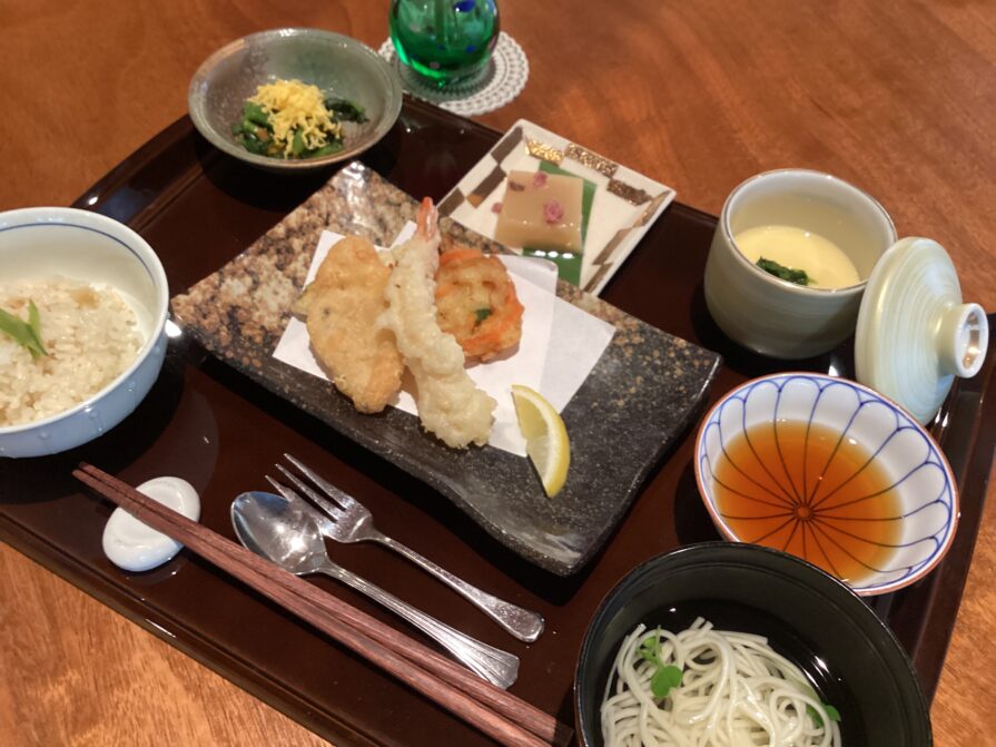 海老や春の野菜たっぷりの天ぷらや茶わん蒸し、菜の花の錦糸和えに、春がやって来た!と心が弾むようです。